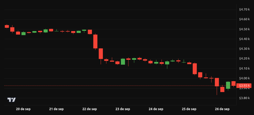 Ethereum cierra en aproximadamente 3,925.82 dólares, consolidando una semana dominada por ventas. El activo arrancó cerca de los 4,000 dólares, con intentos de avanzar hacia los 4,100 dólares, pero la resistencia en ese nivel provocó rechazos. A lo largo de la semana, la caída lo llevó a probar los 3,900 dólares, un soporte intermedio que todavía contiene al precio.