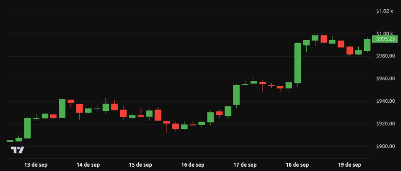 La proximidad al nivel psicológico de los 1,000 dólares añade importancia a cómo reaccionen los compradores frente a resistencias inmediatas.