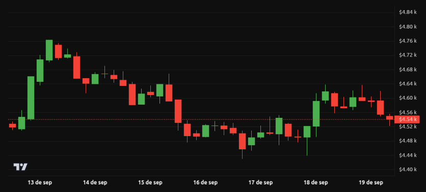 Ethereum cerró la semana cerca de 4,540 dólares, manteniéndose en un rango técnico que va desde los 4,500-4,650 dólares en sus picos semanales. Aunque no hizo un impulso decisivo para romper resistencias superiores, ETH defendió bien sus soportes bajos sin mayores caídas.