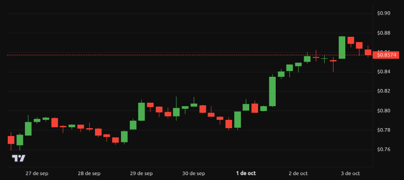 Técnicamente, el soporte está en torno a 0.80-0.85 dólares, zona que ha contenido caídas en semanas recientes. Una ruptura por debajo podría llevar a retrocesos hacia 0.75-0.70 dólares. En el lado opuesto, la resistencia clave se encuentra en el rango de 0.90-0.95 dólares.