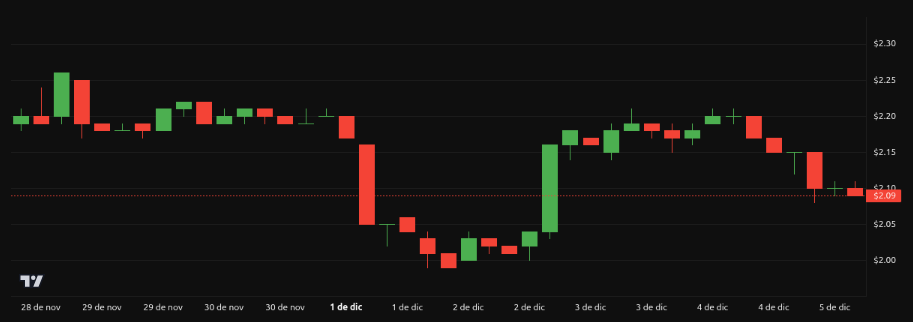 XRP ha operado de manera más estable esta semana tras episodios de volatilidad previa. El soporte crucial se mantiene en 2.00 dólares, nivel donde han aparecido compradores. Mientras se mantenga por encima, puede aspirar a un movimiento hacia 2.40-2.70 dólares.