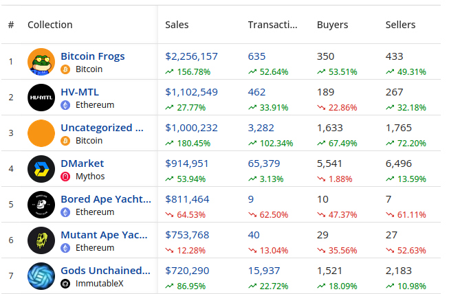 De esta forma, Bitcoin Frogs se ha convertido en la colección NFT más popular, superando a gigantes como Bored Ape Yacht Club y Bored Ape Yacht Club, según los datos de CryptoSlam.