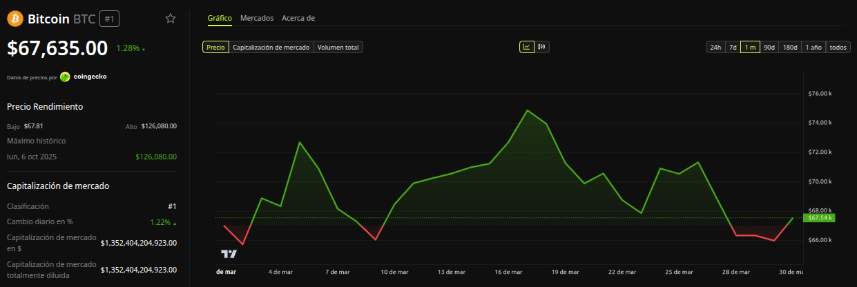 En paralelo, el contexto del mercado añade interés. Tras la publicación, se observó un leve movimiento al alza en minutos posteriores: al momento de la publicación, Bitcoin cotizaba en 67,635 dólares con un aumento del 1.28% en las últimas 24 horas.