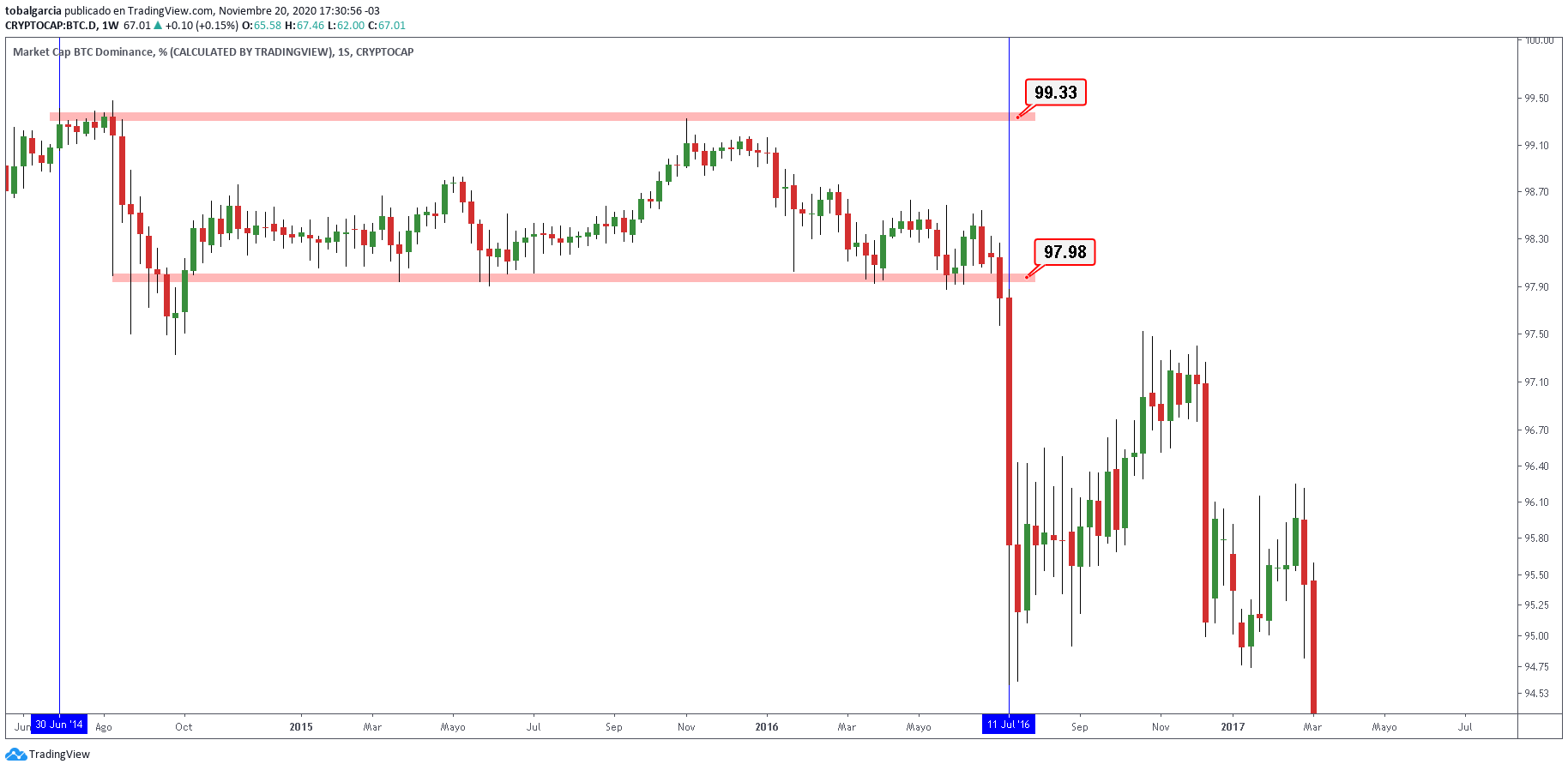 SponsoredFue el 11 de julio de 2016 el día que se dio el quiebre de la “tendencia lateral” en la dominancia de Bitcoin, cuando la cifra por debajo del 95% desestabilizó la simétrica estructura de su gráfico.