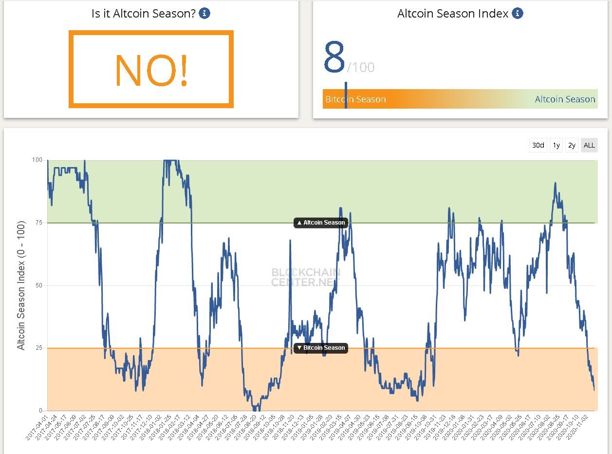 El índice de la “altcoin season” marca todo lo contrario a su nombre