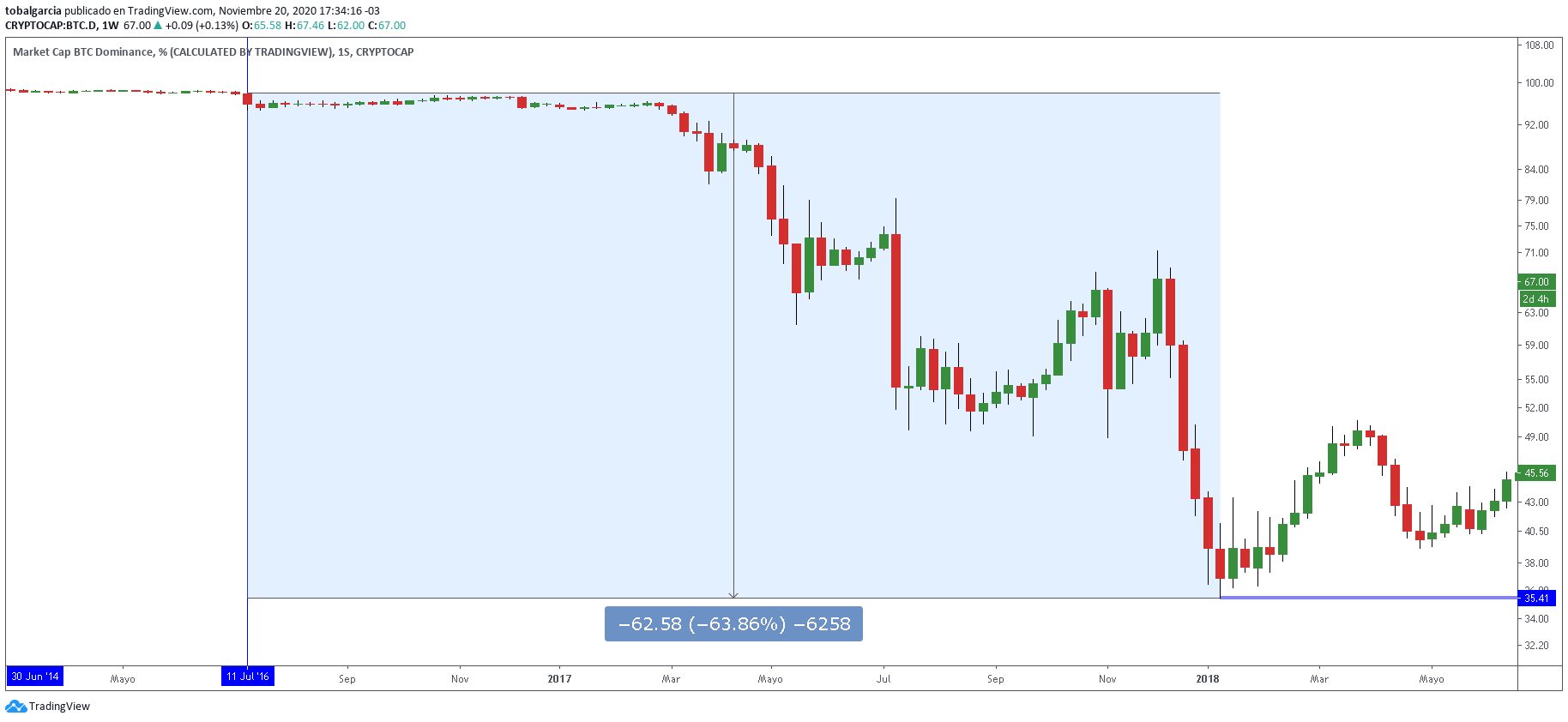 A partir de este momento, y por el siguiente año y medio, la dominancia de Bitcoin cayó en picada marcando un mínimo histórico de 35,41%.
