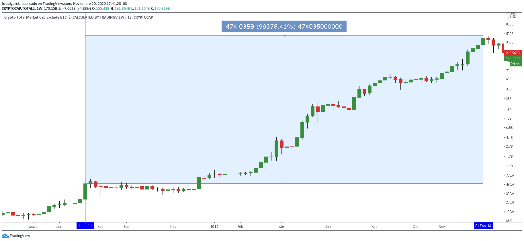 Siguiendo la misma idea, dicha caída de la dominancia de Bitcoin fue claramente respaldada por una estrepitosa subida en la capitalización del mercado de las altcoins, cuyos valores pasaron de 476 millones de dólares a 474 mil millones de dólares —máximo histórico del 1 de enero de 2018—, marcando así un increíble aumento de 99.000%.