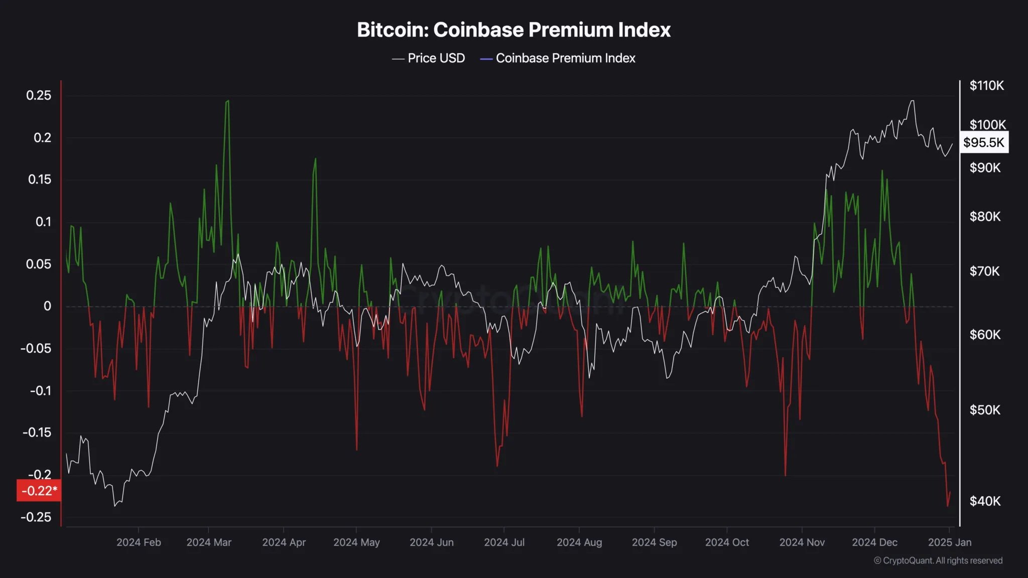 Sin embargo, al momento de escribir esto, el índice ha caído a -0,22, el nivel más bajo en los últimos 12 meses. Esta caída significativa indica que los inversores de Bitcoin en Estados Unidos están vendiendo sus activos. A pesar de eso, el precio de Bitcoin se negocia a 95,318 dólares, lo que representa un leve aumento del 2,06% en las últimas 24 horas.