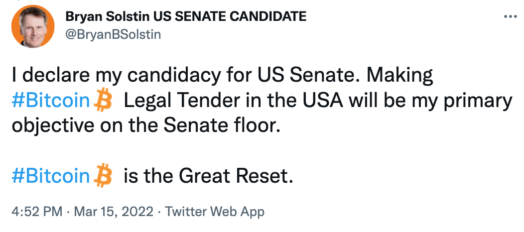 Bryan Solstin, un defensor de la privacidad, se hizo viral en el Twitter cuando presentó su candidatura al Senado de los Estados Unidos, donde dijo sin tapujos que su principal objetivo sería legalizar bitcoin como moneda de curso legal por todo el territorio estadounidense.