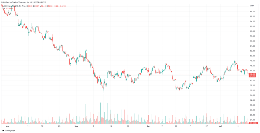 Tras otra caída a 40 dólares y un aumento a 46 dólares, ARKK actualmente cotiza alrededor de 43 dólares.