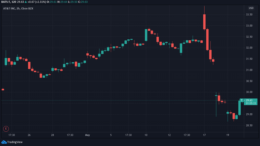 Aunque AT&T (T) había subido marginalmente desde su último informe de ganancias el 21 de abril, perdió mucho más de esas ganancias el 17 de mayo.