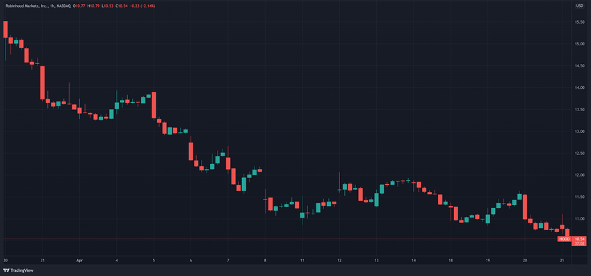 Robinhood se ha desplomado un poco en el transcurso de abril. El 30 de marzo, HOOD cotizaba a 15.50 dólares, cayendo a 13.50 dólares a principios de abril.