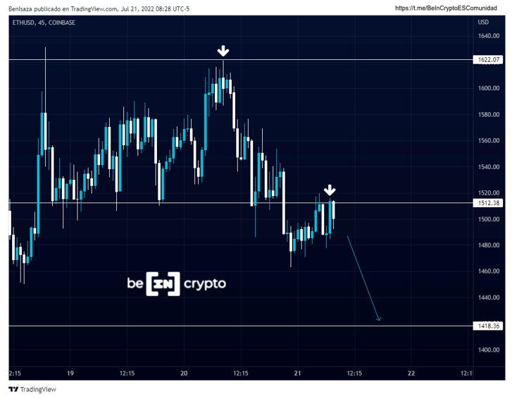 ETH/USD Ha creado un doble techo o doble alto sobre el área de liquidez de los 1,500 dólares y propone una continuidad bajista con posible objetivo alcanzar 1,418 dólares.
