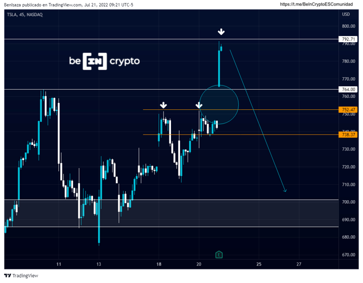 Tesla presentaba una formación bajista tras crear un doble techo sobre la barrera de los 752 dólares. Durante el cierre de la sesión de NYSE la cotización en Tesla subió un 7.52% en su cotización con la posibilidad de alcanzar los 800 dólares por acción.