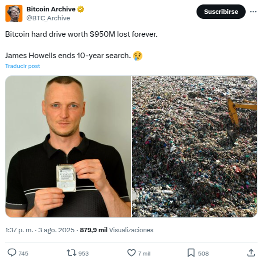 Sponsored“Tras más de una década, James Howells finalmente ha renunciado a su búsqueda del disco duro que accidentalmente tiró en 2013 y que contenía 8,000 Bitcoin, ahora valorados en 950 millones de dólares. Para 2030, podría valorarse en 8 mil millones de dólares”, escribió un observador del mercado.