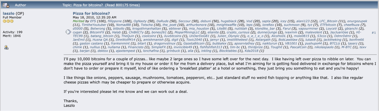 ¿Qué ocurrió exactamente aquel sábado de 2010? Laszlo Hanyecz, un desarrollador de Bitcoin, hizo historia al comprar dos pizzas grandes por 10.000 BTC. La transacción se hizo a través del foro Bitcointalk con un post que decía lo siguiente: