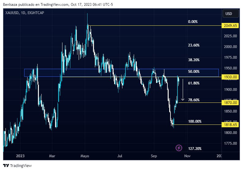 En el corto plazo ,el oro de no superar la barrera psicológica de los 1,930 dólares y 1,950 dólares, propone un retroceso con objetivo los 1,880 dólares, un área importante sea para consolidar y acumular o distribuir y continuar descendiendo.