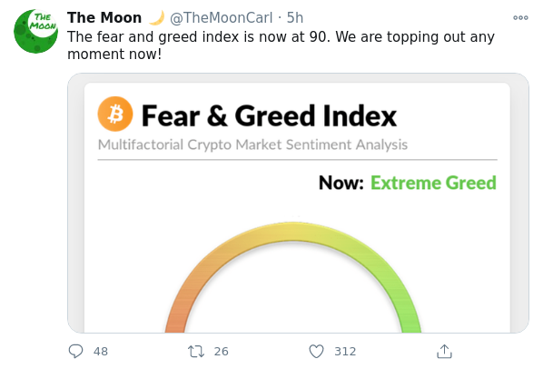 Como destacaba el analista de mercado The Moon (@TheMoonCarl) con anterioridad, el regreso de la codicia extrema puede indicar un precio máximo local. La cita de Buffett que inspiró el indicador mismo advierte que el exceso de confianza en un mercado a menudo precede a una rectificación.
