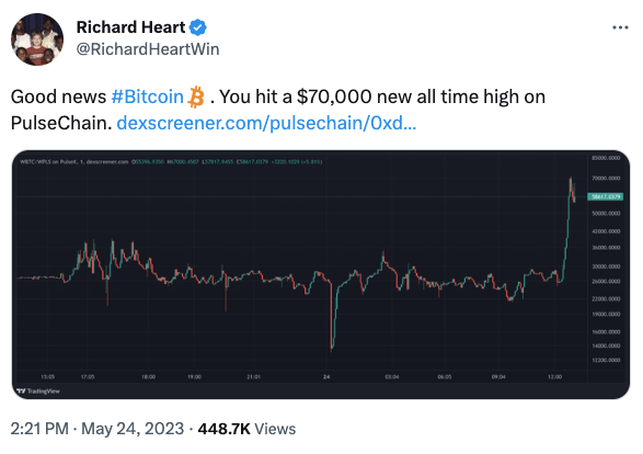 El mercado cripto tiene oportunidades lucrativas meramente especulativas en rincones remotos. El Wrapped Bitcoin (WBTC) dentro del nuevo blockchain de Richard Heart, Pulsechain, ha alcanzado un nuevo record histórico en el precio de bitcoin, llegando a tocar los 70.000 dólares.