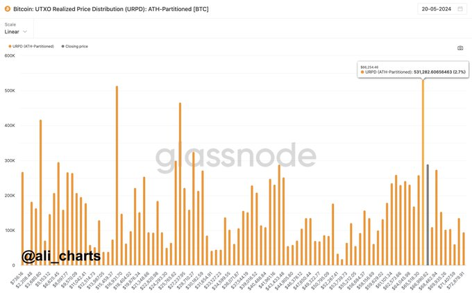 “Con más de 530.000 $BTC negociados a 66.250 dólares, ¡este es un nivel de soporte crucial! Si se mantiene, #Bitcoin tiene un gran potencial para obtener mayores ganancias”, señaló Martínez.
