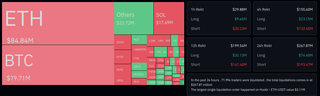 En medio de la volatilidad, el futuro de Bitcoin sigue siendo incierto. En las últimas 24 horas se han liquidado 267,87 millones de dólares en criptomonedas, incluyendo 45 millones de dólares en posiciones cortas de Bitcoin, refleja la volatilidad del mercado y la incertidumbre entre los inversores.