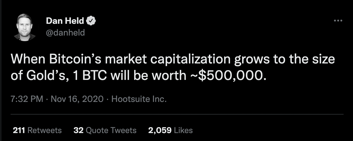 La capitalización de mercado actual de Bitcoin supera los 366 mil millones de dólares, mientras que la capitalización de mercado del oro se estima en más de 11 billones de dólares. La capitalización de mercado de Bitcoin tendrá que crecer más de 30 veces para cambiar la capitalización de mercado del oro.