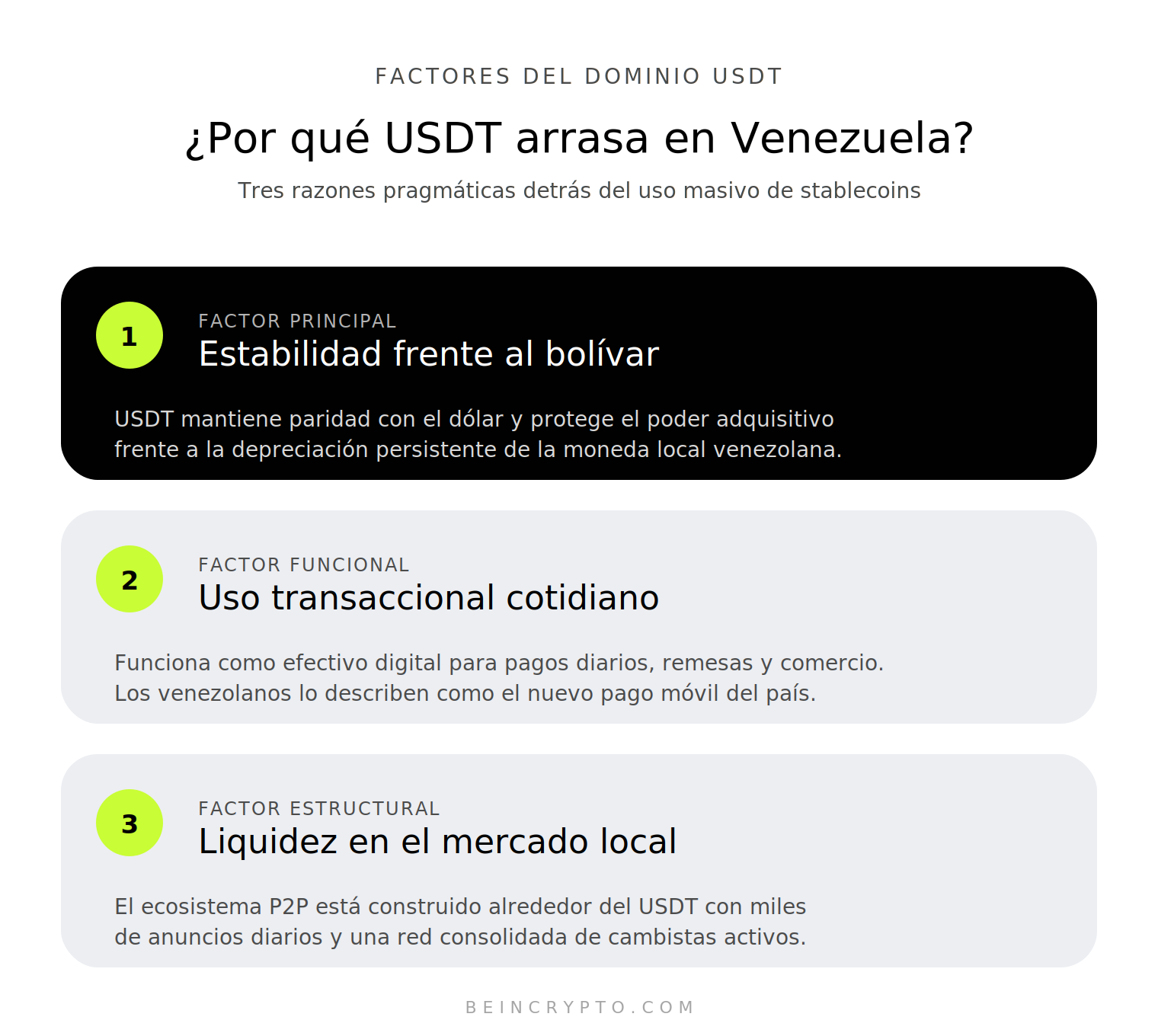 La estabilidad de precio es el factor decisivo. El bolívar perdió valor de forma dramática durante años consecutivos, y la población necesita un activo que mantenga su poder adquisitivo. USDT mantiene paridad con el dólar estadounidense, ofreciendo esa protección inmediata frente a la inflación.