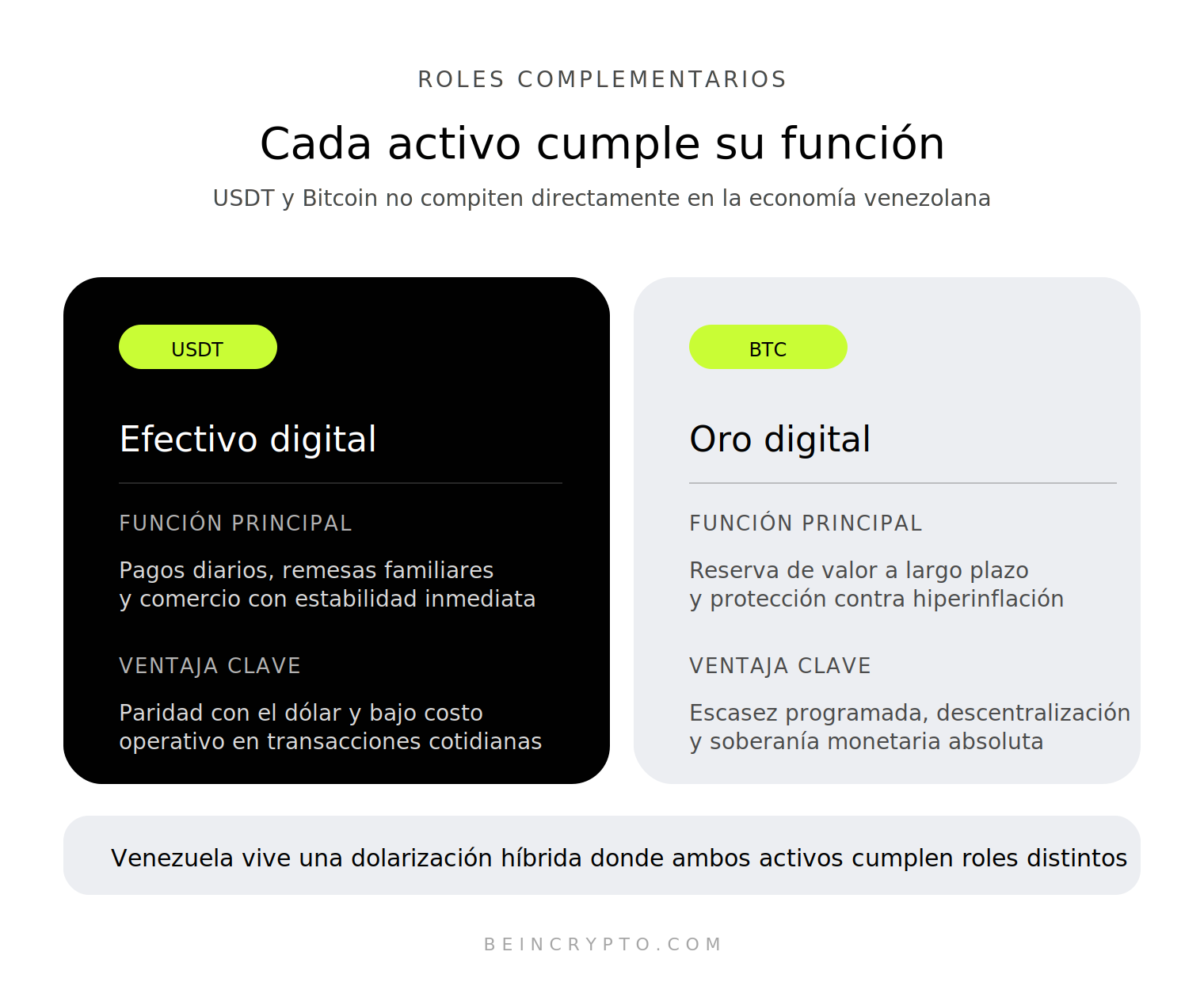 La diferencia de adopción entre ambos activos no responde a desconocimiento ni rechazo ideológico. Es una decisión profundamente pragmática: USDT resuelve la urgencia de supervivencia financiera diaria, mientras Bitcoin representa la visión de soberanía monetaria a largo plazo dentro del mismo ecosistema.
