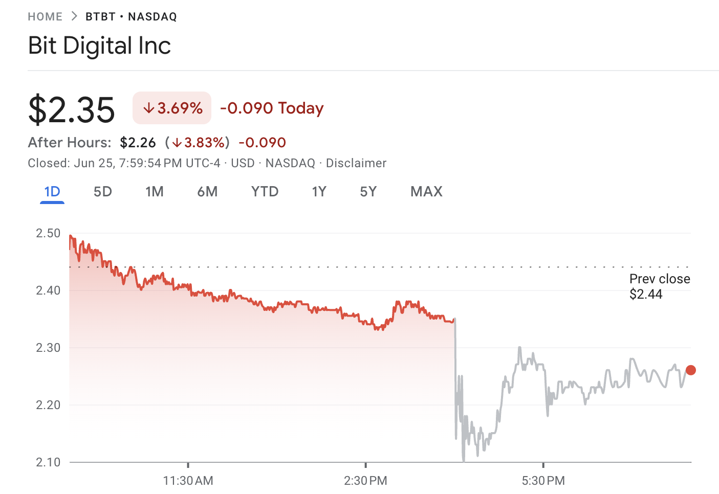 Mientras tanto, el movimiento de Bit Digital no impactó positivamente en los precios de sus acciones. Los datos de Google Finance mostraron que BTBT cayó un 3.69% al cierre del mercado.