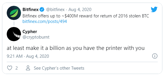 Como señaló el artista CGI Cypher en Twitter, ofrecer una recompensa multimillonaria es fácil cuando puede imprimir la moneda. Si Bitfinex y Tether son iguales, ¿qué les impide imprimir la recompensa de 400 millones de dólares en USDT?