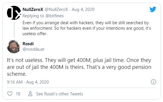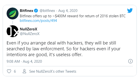 Por otro lado, es posible que los piratas informáticos puedan ser investigados dependiendo de si Bitfinex está trabajando con las autoridades o no. En otras palabras, los hackers pueden tener más que perder si se presentan.