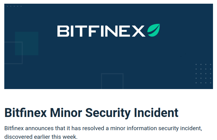 De acuerdo al comunicado oficial del exchange: “Bitfinex anuncia que ha resuelto un incidente menor de seguridad de la información, descubierto a principios de esta semana”.