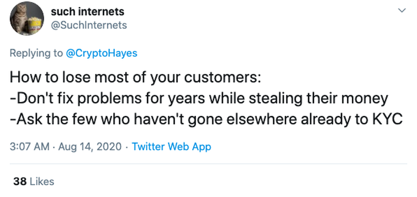 Esta historia es una que se ha desarrollado repetidamente en la década de existencia de Bitcoin. Se lanza un exchange y promete un servicio que no requiere verificación KYC y AML. Luego, una vez que escala, atrae la atención de los reguladores y cede bajo la presión, lo que finalmente obliga a sus usuarios a cumplir.