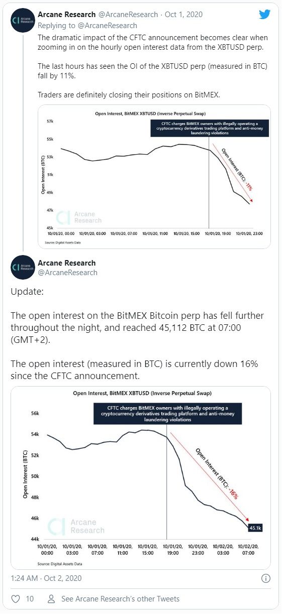 El desarrollo más reciente es una grave escalada de las circunstancias de BitMEX, que vio un éxodo de usuarios tras las acusaciones. Los inversores retiraron más de 37.000 BTC, mientras que el interés abierto cayó un 16%, según Arcane Research.