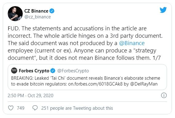 Binance, el exchange de criptomonedas más grande del mundo, también enfrenta problemas. Forbes publicó un informe el 29 de octubre que apunta a un documento filtrado que alega que Binance buscaba eludir las regulaciones estadounidenses.