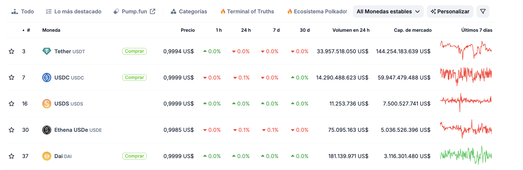 Actualmente, la capitalización del mercado de las stablecoins es de 232,8 mil millones de dólares, mientras que su volumen de trading es de 98,4 mil millones de dólares. Las stablecoins más grandes son USDT, USDC, DAI y USDe, cuyas capitalizaciones de mercado oscilan entre los 5 mil y los 144 mil millones de dólares.