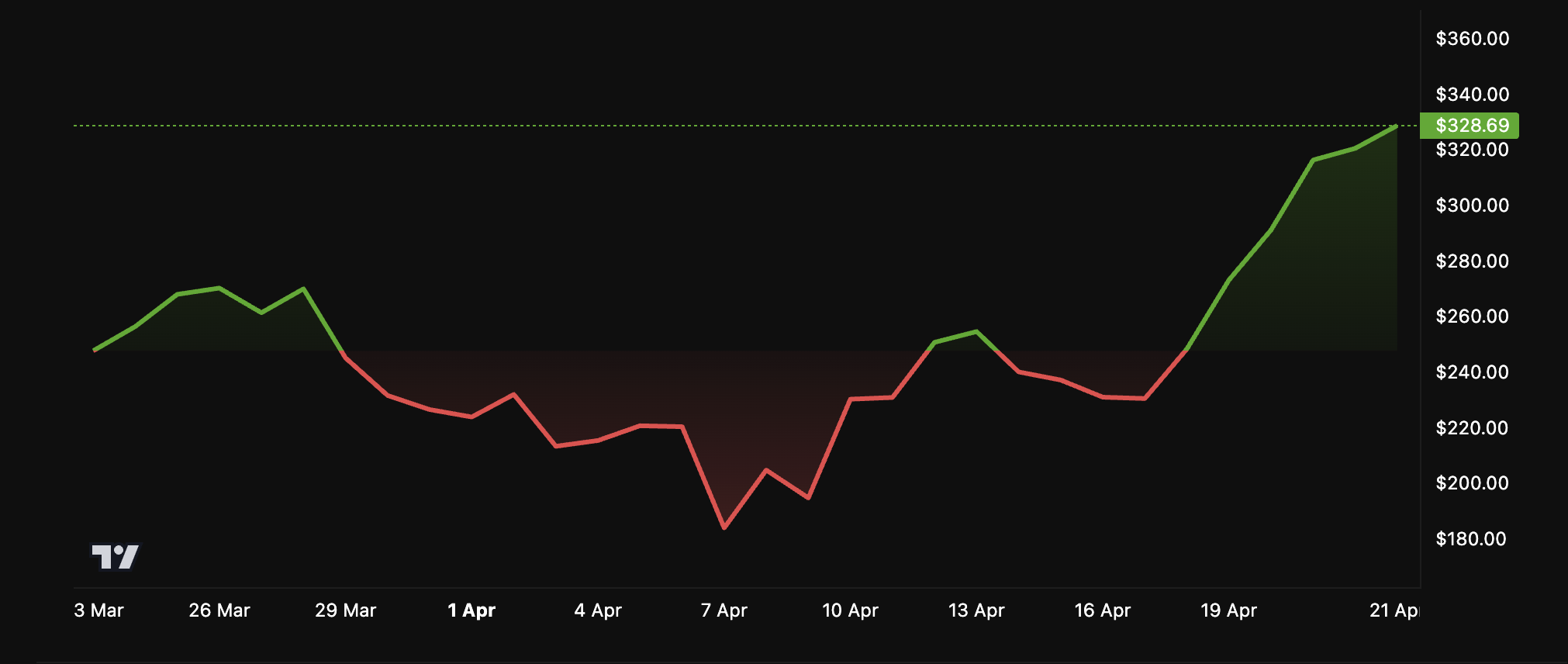 Los datos del mercado reflejan el creciente entusiasmo por Bittensor. Notablemente, en medio de la volatilidad actual, TAO ha tenido un buen desempeño en comparación con el mercado en general, subiendo 32.1% en la última semana. Al momento de la publicación, la altcoin se negociaba a 328 dólares, un aumento del 7.2% en el último día.