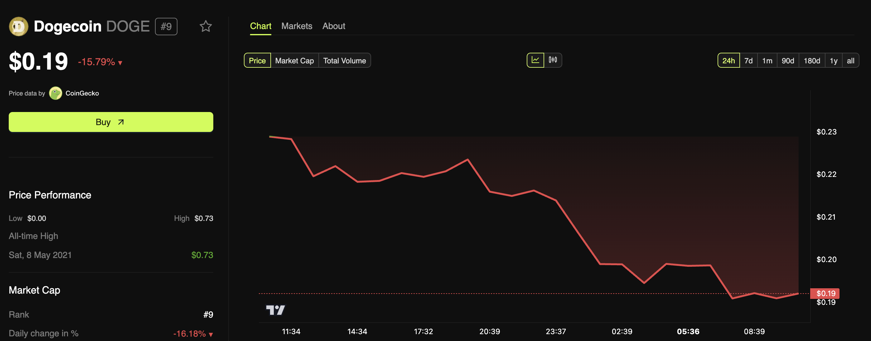 Al momento de escribir, la memecoin se negociaba a 0.19 dólares, reflejando una caída del 15.79% en las últimas 24 horas. El volumen de trading también ha sufrido un fuerte golpe, mostrando una disminución del 16.80%, señalando una actividad de mercado debilitada a pesar de la narrativa del ETF.
