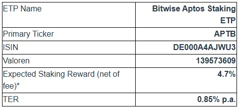 Tras la adquisición del Grupo ETC en agosto de 2024, Bitwise ha extendido rápidamente su cartera de ETP respaldados físicamente. Específicamente, incluye opciones de staking de Bitcoin (BTC), Ethereum (ETH) y ahora Aptos. Este desarrollo refuerza aún más la posición de Bitwise en el mercado de activos digitales de Europa.