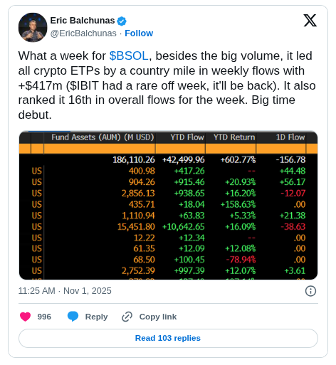 El 1 de noviembre, el analista de ETF de Bloomberg Eric Balchunas informó que BSOL atrajo aproximadamente 417 millones de dólares en su primera semana de trading. Ese rendimiento colocó al fondo entre los 20 principales ETF de todas las clases de activos por entradas netas.