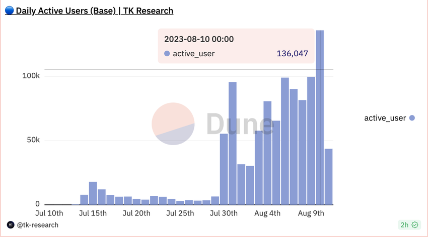 El día del lanzamiento, los usuarios activos diarios casi alcanzaron el hito de los 100,000. Pero Base obtuvo una puntuación aún mejor al día siguiente, registrando 136,047 usuarios activos diarios.