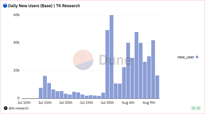 Además, el 9 de agosto, Base fue testigo de 30,431 nuevos usuarios y 41,993 nuevos usuarios al día siguiente. Sin embargo, el máximo histórico de nuevos usuarios se registró el 31 de julio, antes del lanzamiento público. Más de 60,000 nuevos usuarios probaron la blockchain Base de Coinbase el 31 de julio.