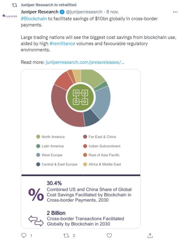 Un reciente informe de la consultora inglesa de análisis de inteligencia, Juniper Research, reveló que la tecnología blockchain generará ahorros al sector financiero internacional, sobre todo en pagos transfronterizos, por $10,000 millones de dólares en 2030, cuando actualmente la cifra es de apenas 301 millones de dólares.
