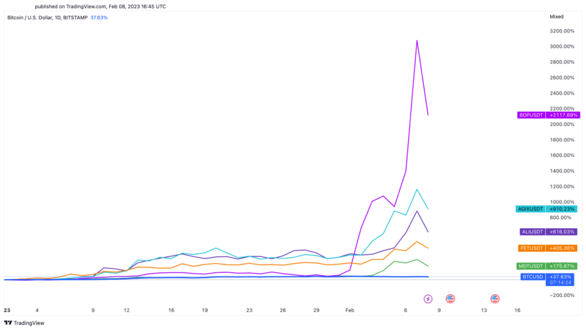 Los tokens populares únicos de 2018 y 2021, como Big Data Protocol (BDP) y Measurable Data (MDT), se están subiendo al carro, recordando a los inversores cómo utilizan la tecnología de IA en sus aplicaciones de blockchains. BDP experimentó un aumento del 2,100 % la semana pasada, mientras que MDT aumentó 150%.