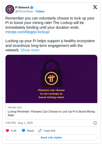 El anuncio del 2 de agosto animó a los Pioneros a bloquear sus tokens PI a cambio de tasas de minería mejoradas. Esto provocó una rápida reacción en las redes sociales, particularmente en X (anteriormente Twitter).