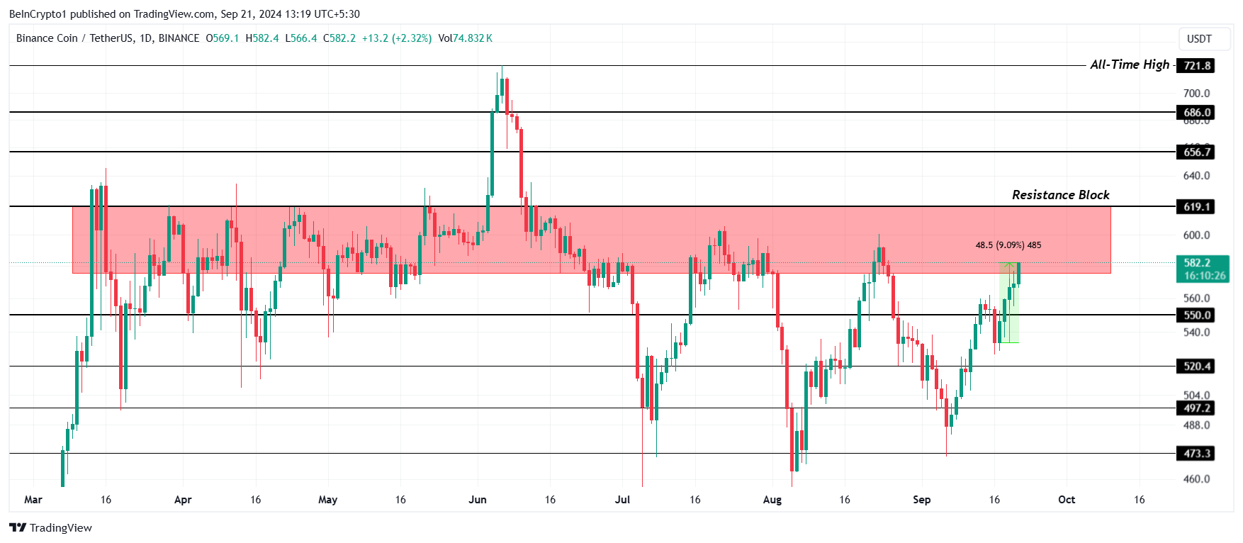 El precio de BNB ha aumentado más del 9% en los últimos cinco días, cotizando actualmente a 582 dólares. Aunque la altcoin logró superar la resistencia inicial en 575 dólares, es probable que retroceda antes de superar con éxito la barrera en 619 dólares.