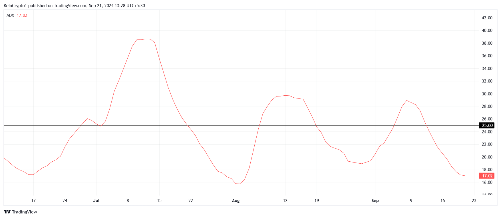 El impulso macro de BNB está respaldado por el Average Directional Index (ADX), que mide la fuerza de una tendencia. Actualmente, el ADX está bien por debajo del umbral clave de 25.0, lo que indica que la tendencia alcista actual carece de la fuerza necesaria para sostenerse. Como resultado, es alta la probabilidad de que BNB pierda su tendencia alcista y entre en una tendencia bajista.