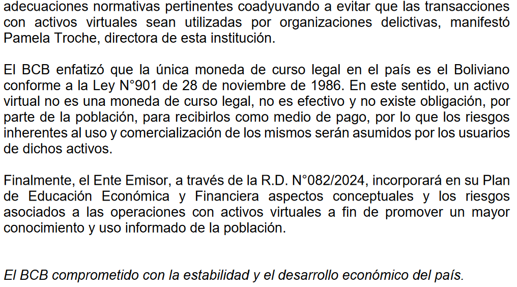 Sin embargo, también enfatizó la necesidad de considerar los riesgos inherentes de estas operaciones y recordó que el boliviano sigue siendo la única moneda de curso legal en Bolivia y que nadie está obligado a aceptar criptoactivos como medio de pago.