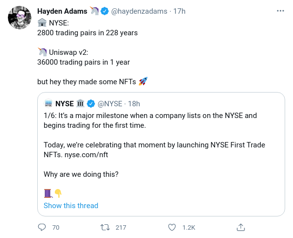 La comunidad cripto ha dado respuestas muy variadas. Hayden Adams, fundador de Uniswap, señaló con descaro que Uniswap introdujo muchos más pares de trading en un año que la NYSE en 228.