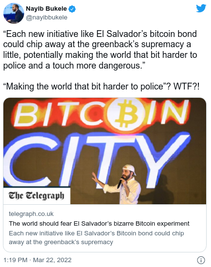 Anteriormente, desestimó los informes de que la adopción de Bitcoin en El Salvador hará del mundo un lugar más difícil de controlar.
